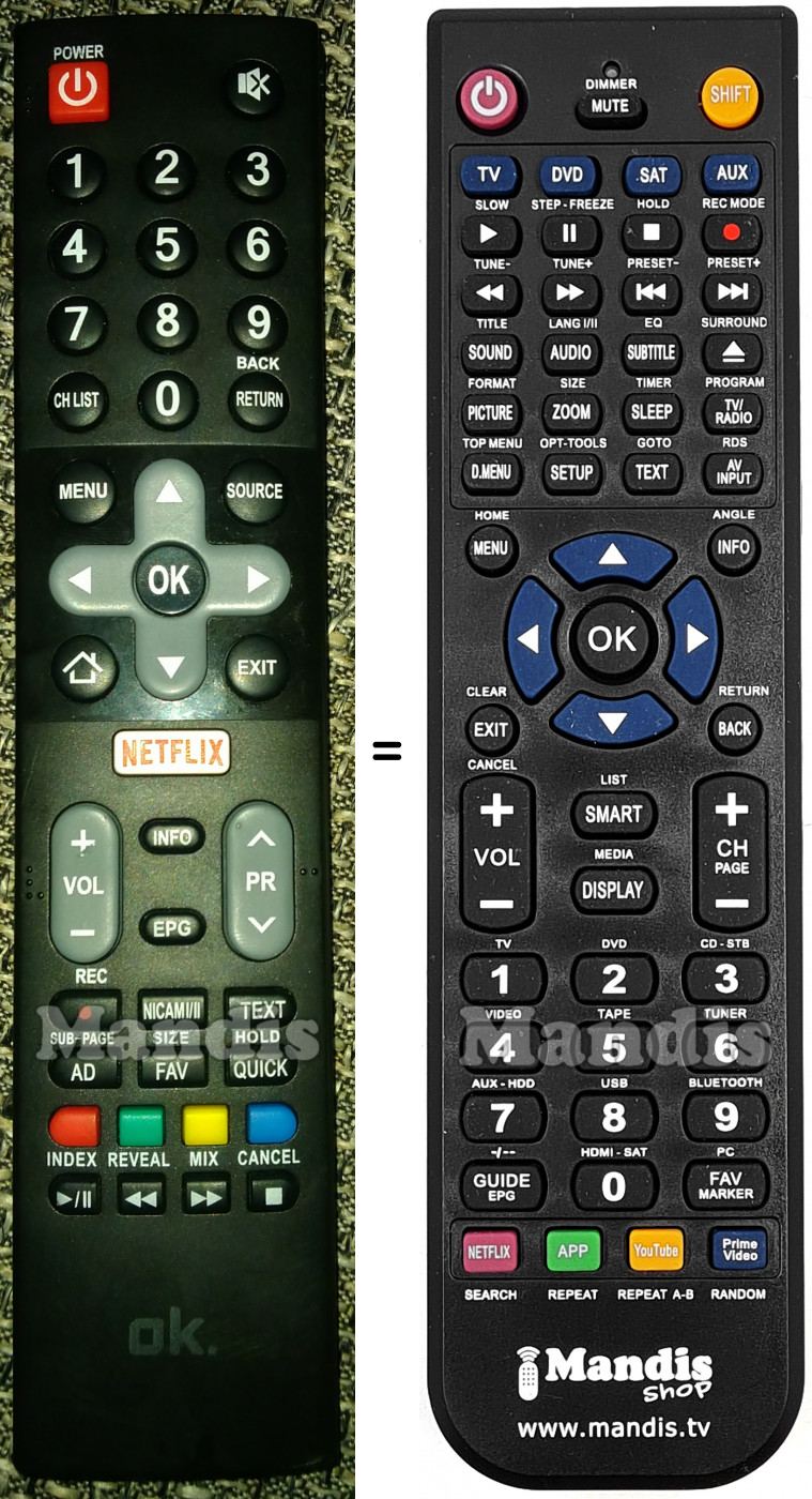 Below, we will show you the correspondence between each button on the original remote control and the button that performs the same function on the replacement remote control. In some cases, you may need to press the SHIFT key before pressing another button to perform certain actions. These additional functions are often not widely used and are included to facilitate understanding of the replacement remote control, or because the original remote control has more buttons than its equivalent.