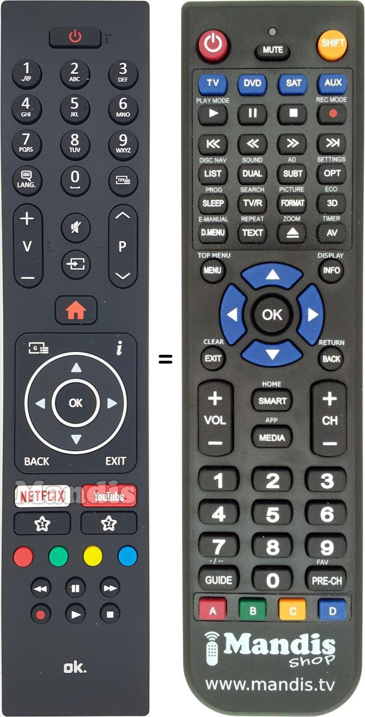 Below, we will show you the correspondence between each button on the original remote control and the button that performs the same function on the replacement remote control. In some cases, you may need to press the SHIFT key before pressing another button to perform certain actions. These additional functions are often not widely used and are included to facilitate understanding of the replacement remote control, or because the original remote control has more buttons than its equivalent.